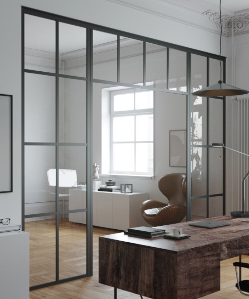 Kiinteä lasiseinä yläikkunalla ja ruudukolla